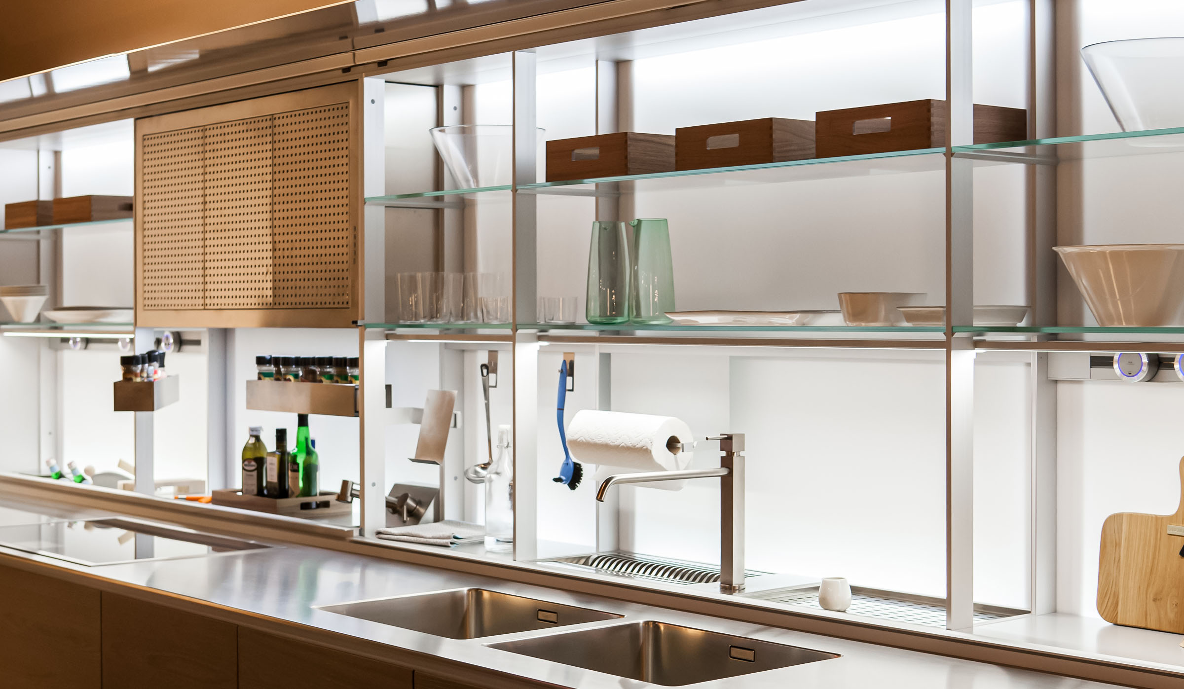 Valcucine reinvented kitchen ergonomics, planning new experiences through the special unit add-ons: the perfect interaction with kitchen cabinets.